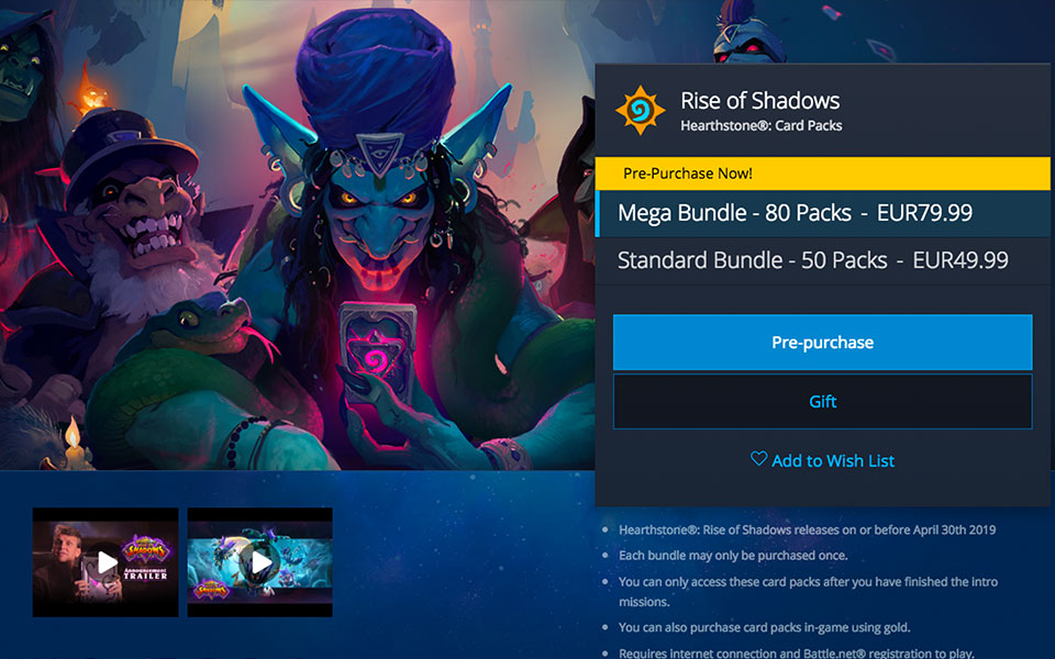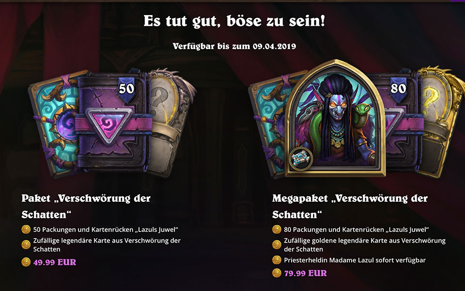 Seit Oktober 2014 spiele ich bereits Hearthstone, mit vollster Begeisterung in den ersten beiden Jahren, aber irgendwie hat sich Hearthstone immer mehr und mehr zum Pay to Win Spiel entwickelt, wo es auf Skills, also Können gar nicht mehr ankommt, sondern wer das meiste Geld in das Spiel investiert. Weil seit geraumer Zeit rotieren die Kartendecks unheimlich schnell und Karten, die man noch vor einem Jahr gekauft hat, kann man im Standard Modus nicht mehr spielen. Sondern nur ehr im Wild Modus. Und seit einem Jahr gibt es immer zwei Vorverkauf Pakete bei Hearthstone zu kaufen, eines für 50 und eines für 80 Euro, und yepp, wer nicht beide kauft, hat einfach einen Nachteil von Anfang an. Blizzard nötigt uns Spieler also, alle 4 Monate 130 Euro nur für die Erweiterungen auszugeben, die dann gerade Mal ein Jahr ihre Gültigkeit besitzen. Das sind im Jahr 520 Euro, nur für die Erweiterungen, von den Solo Abenteuer und den Aktionen alle 1-2 Monate fang ich gar nicht zu sprechen an. Mit denen sind wir locker über 600 Euro.